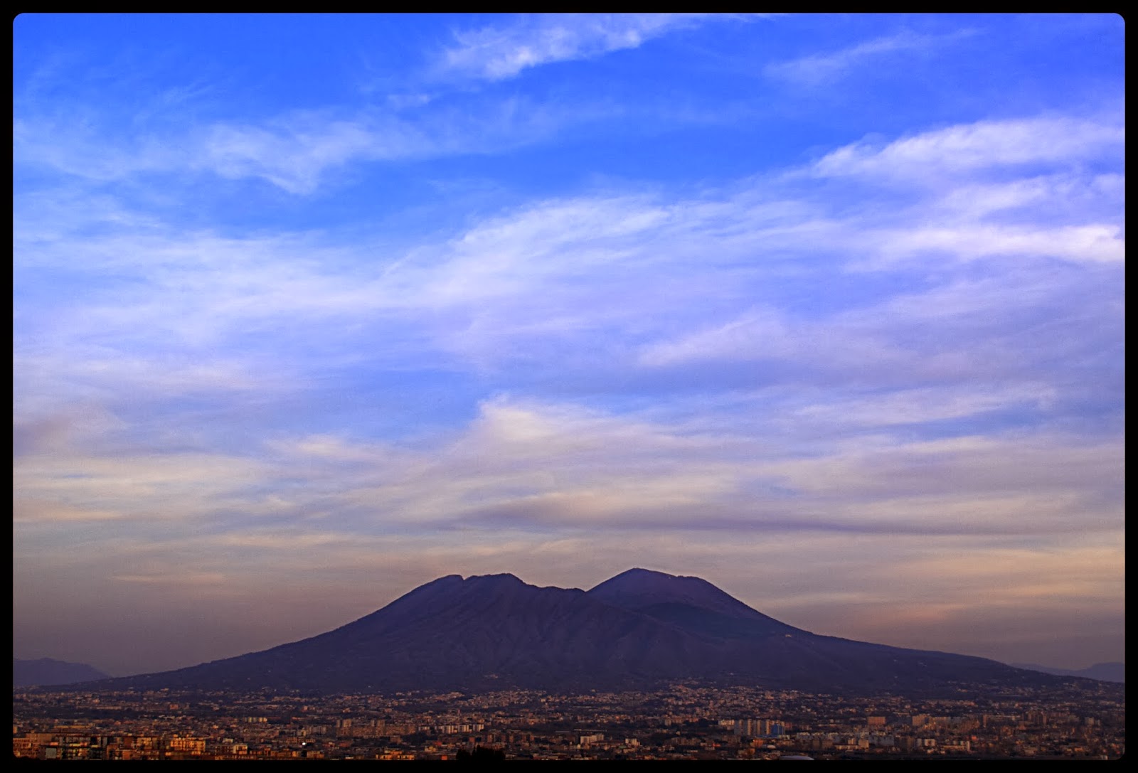 Read an "inspirational" quote today that said "live your own life instead of watching others live theirs on TV." That makes living a life seem the simplest thing in the world. Mush as I'd love it to be otherwise, Life is far from simple. Living it even less so. One can spend all one's years trying to keep things basic, but Life intervenes. I've always wanted people to be happy; stressed folk just make me crazy. I probably spend too much effort and time concerned with how others react and deal with situations, when I ought be reacting and dealing my own self. On that uplifting fuss, the re-done foto for the day is the old Vesuvius postcard. Better light and background on this one.